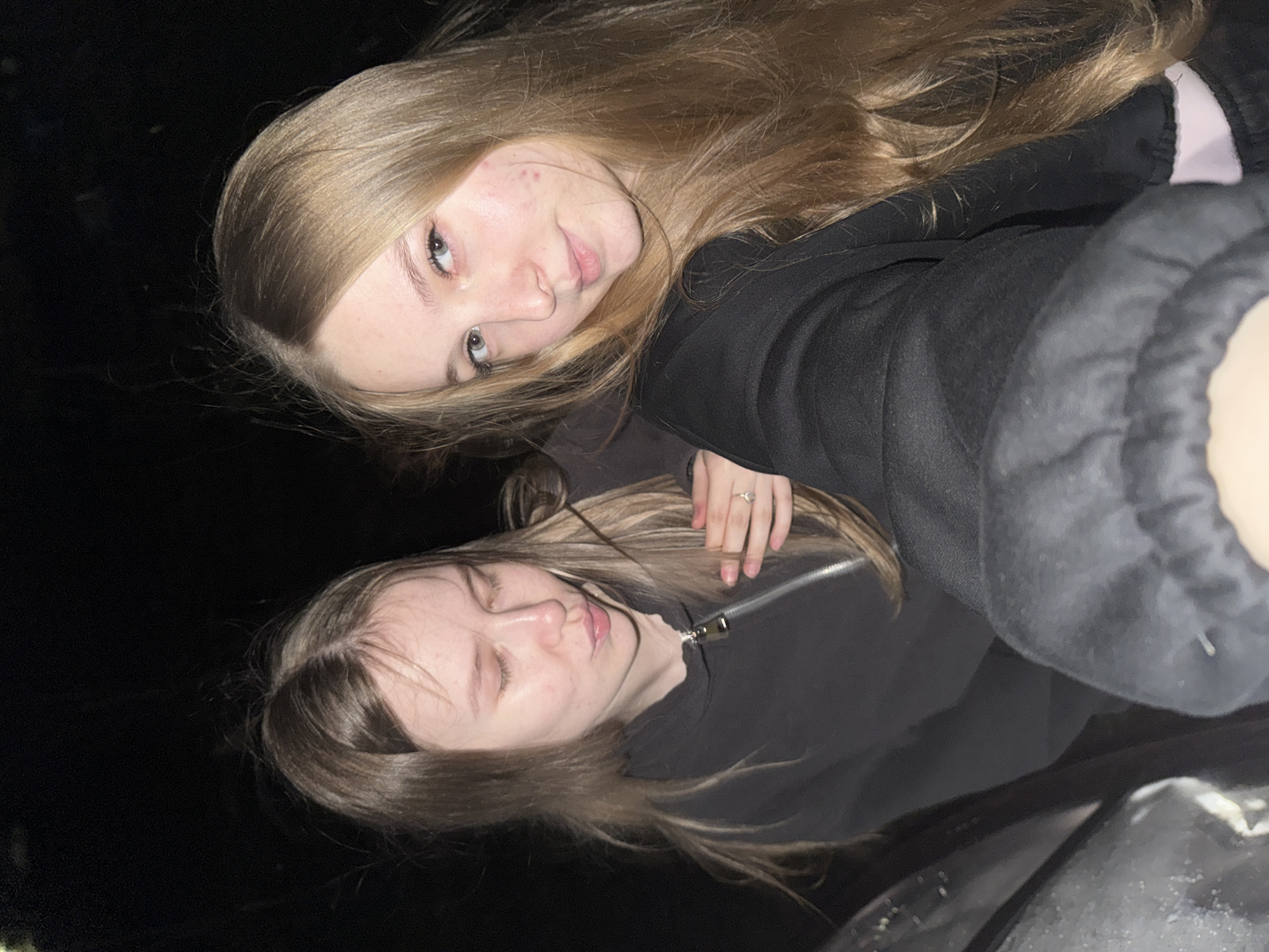 Two young women are in the dark and take a photo of themselves. The background is indiscernible. One woman is on top, with long blonde hair, and is looking at the camera. The other woman is below and looking towards the right. She has a dark jacket. There is a diamond ring on the top woman’s hand.