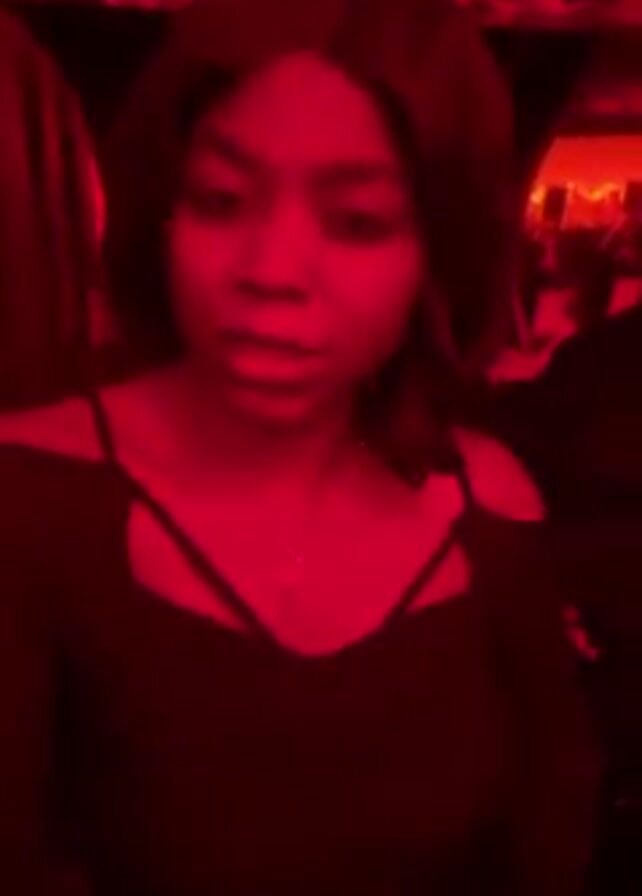 A woman with dark hair and skin is illuminated by a red light. She is wearing a dark top with spaghetti straps and stands in front of a shelf holding glassware. She is talking and gesturing with her hands. The background is blurry and dimly lit.