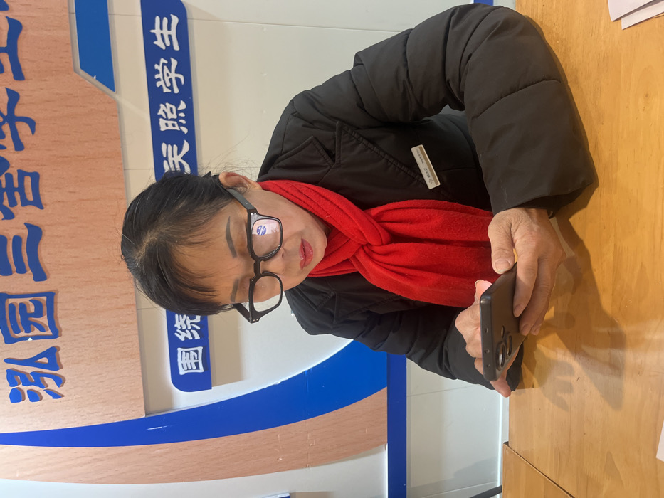 An elderly Asian woman with dark hair and glasses looks at a smartphone held in her hands. She wears a black padded jacket and a bright red scarf. Part of a sign with blue and brown tones appears behind her. The surface beneath the phone appears to be a light wood, possibly a table or desk. The image is taken at an angle, rotated slightly counter-clockwise.