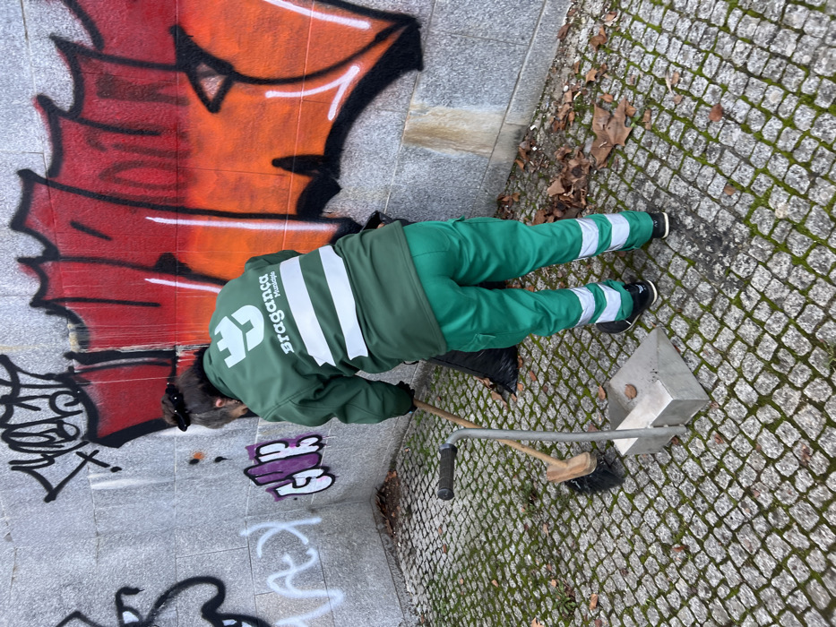 A person in green work clothes and reflective stripes cleans graffiti off a wall. The wall is covered in various colorful tags. The worker is bent over, using a tool. A black trash bag is nearby. The ground is paved with small square stones, some covered in moss. A metal box and a broom rest on the ground. The scene is outdoors and rotated clockwise.