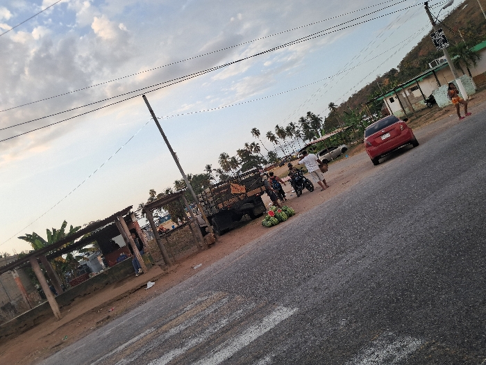 This image captures a roadside scene in Playa Colorada, Venezuela, during late afternoon or early evening