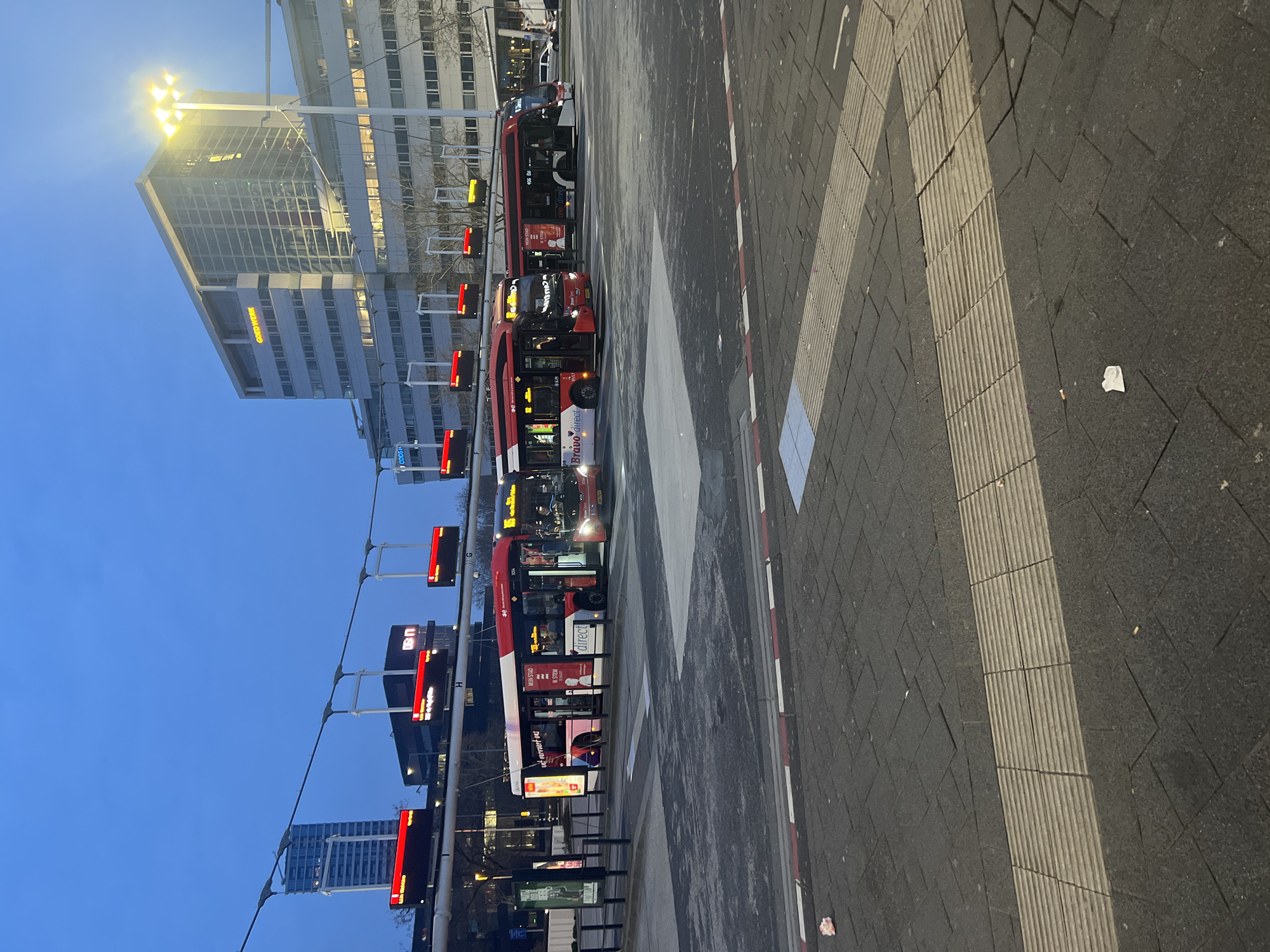 The image depicts a bus station at dusk, identified as the Eindhoven Centraal bus station in Eindhoven, Netherlands