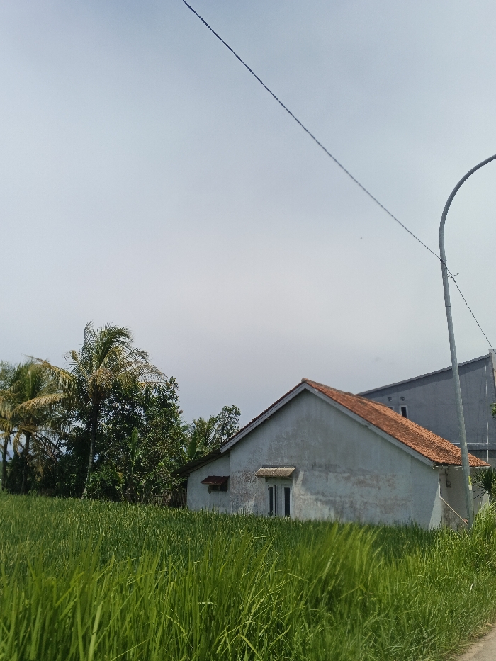 A small, light-grey house with a red-tiled roof stands amidst tall green grass, blending into a rural landscape. Lush trees, including palms, are visible behind the house. A modern gray building is slightly set back from the house. A power line stretches across the sky, while a streetlamp curves upward on the right. The sky is overcast, creating a soft, diffused light. The scene evokes a sense of peaceful countryside living.