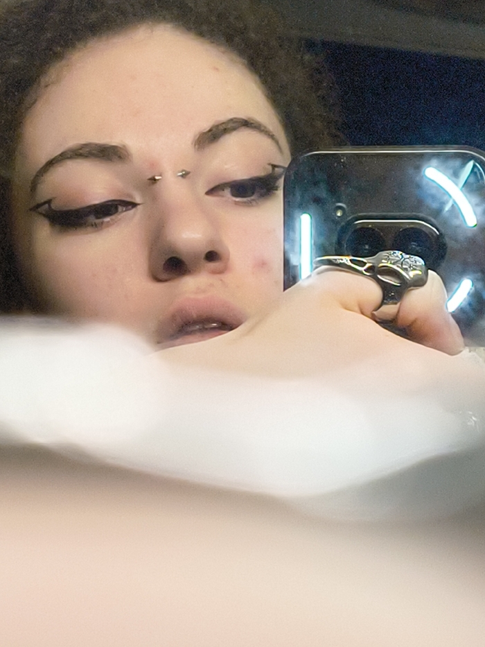 A close-up image captures an individual taking a selfie. The subject's face is partially visible, featuring light skin, dark curly hair, and dark eyebrows. They wear black winged eyeliner and have a bridge piercing with two spike-ended barbells located between their eyes. Their mouth is slightly open. The individual's right hand holds a dark smartphone, which reflects bright, angular light patterns on its surface, suggestive of a ring light or illuminated mirror. A silver-toned ring, shaped like a bird's skull with small, possibly jeweled eyes, is present on the right index finger. The foreground is blurred and light-colored, consistent with an object such as a bathtub edge or counter. The background is dark and indistinct. The location in the city of Tourcoing, France, cannot be ascertained from the visual evidence within the image.