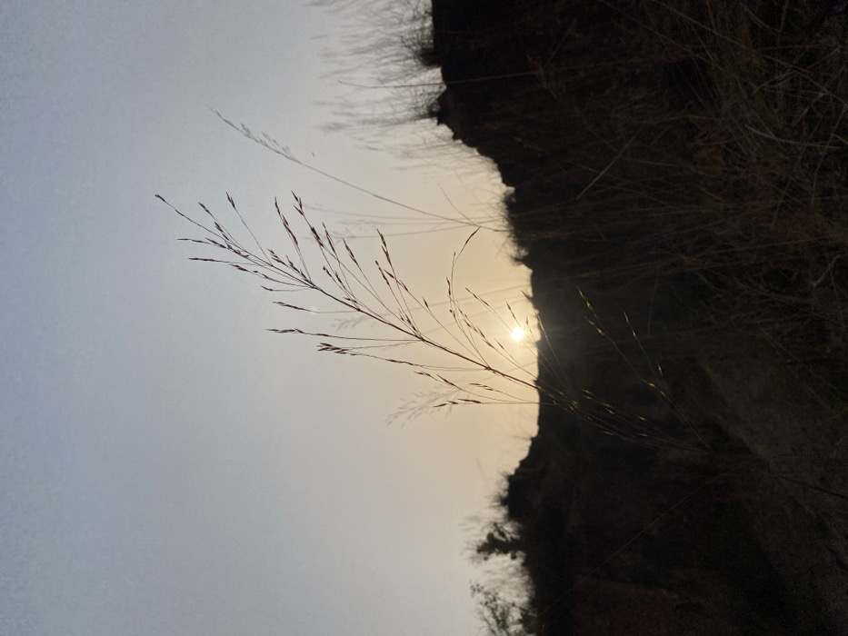 Against a hazy sky, a slender plant stands out with its delicate, branched structure. To the right, a rugged cliff face looms, its dark mass textured with sparse vegetation. The sun, partially obscured by the cliff, casts a soft glow that highlights the plant's wispy form. The composition of the image is mostly horizontal, emphasizing the vastness of the sky while drawing attention to the contrast between the plant and the cliff.