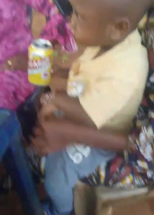 toddler in a yellow shirt and blue pants sitting on someone's lap at an outdoor gathering. There's a woman in a pink dress sitting next to them. On the table in front of them is a can of malt drink, a blue water bottle, and a plate. Other people are in the background. The video is shaky.