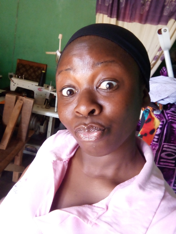 An individual with dark skin, wearing a black headband and a light pink collared shirt, is depicted in a close-up, self-taken photograph. Their eyes are wide open, and their lips are pursed, facing directly towards the camera. The background, consistent with an indoor setting within Maigizo, Nigeria, features a light green wall on the left. An industrial sewing machine with black thread is visible on a white table. Wooden planks lean against the green wall. On the right side, patterned purple curtains are partially visible, alongside a pile of folded fabrics, including one with multicolored patterns and another with purple geometric designs. A white fixture extends into the top right corner of the frame. The environment suggests a workshop or a home-based tailoring area.