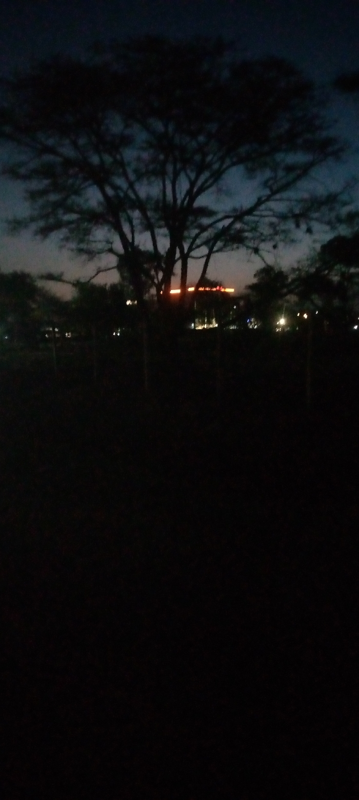 A dark, silhouetted tree dominates the frame against a twilight sky. Faint orange lights are visible through the branches, possibly from a building in the distance. Additional trees and dim lights suggest a cityscape horizon. The foreground is obscured in darkness, making details indiscernible. The composition evokes a sense of quiet and stillness at night.