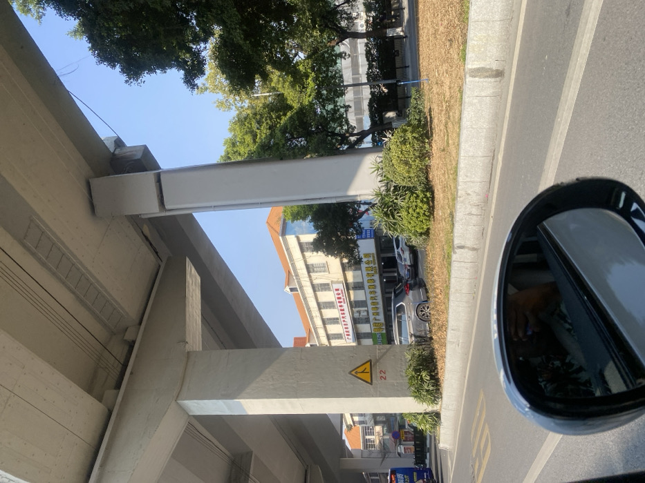 The image captures an urban scene from a low angle, likely from inside a vehicle. Concrete structures of an elevated roadway or bridge dominate the foreground. A building with multiple stories and windows is visible, along with parked cars. The side mirror of the vehicle occupies a portion of the right side, reflecting the interior. Green trees and foliage are present, softening the hard lines of the architecture. A road sign is visible, and the scene is lit by bright daylight.