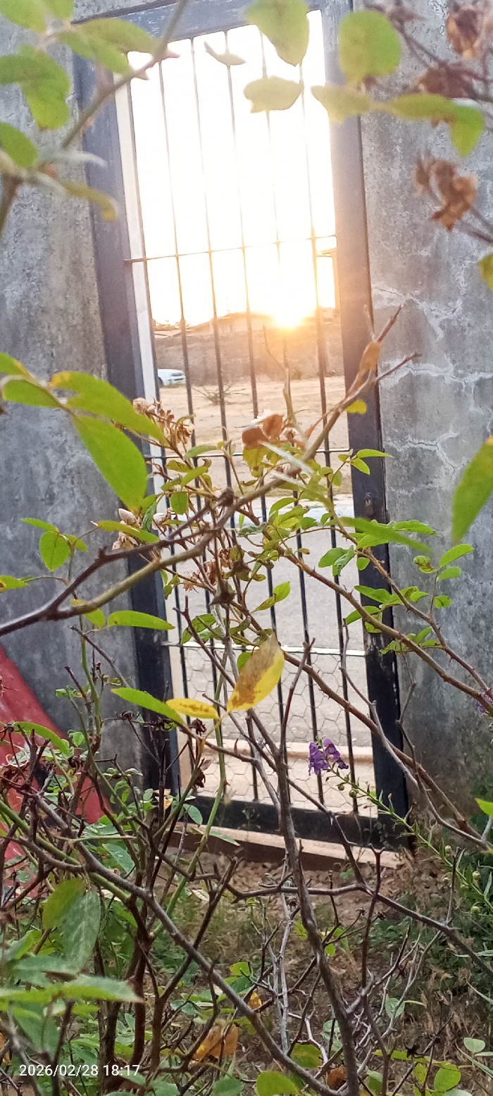 This image depicts an outdoor scene at approximately 18:17 on February 28, 2026, within the city of Altagracia, Venezuela, characterized by a sunset viewed through dense foreground vegetation. The immediate foreground is heavily occupied by a tangle of thorny branches with both green and partially yellowed leaves, indicative of a rose bush or similar shrub. Several small, dried flower buds are visible on these branches. Toward the lower right, a cluster of small purple flowers is present amongst the foliage. Behind the vegetation, a dark-colored metal gate or window bars, featuring both vertical and horizontal elements, frames the background. To the left of this gate, a textured, light grey concrete or cinder block wall is visible. Through the gate, the midground and background reveal an unpaved, open area. The sun is visible setting directly on the horizon, emitting a strong orange and yellow glow across the central and right portions of the background. To the left of the sun's direct light, a light-colored vehicle, possibly white or silver, is partially visible, positioned on what appears to be a dirt road or open ground. Distant, indistinct structures and sparse vegetation are silhouetted against the horizon beneath the setting sun. No individuals are visible in the frame.