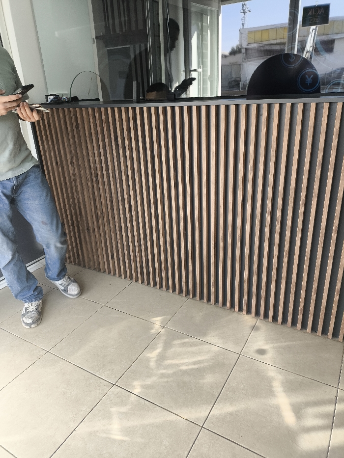 A partially visible person in jeans and a green shirt stands beside a wooden reception desk with vertical slats