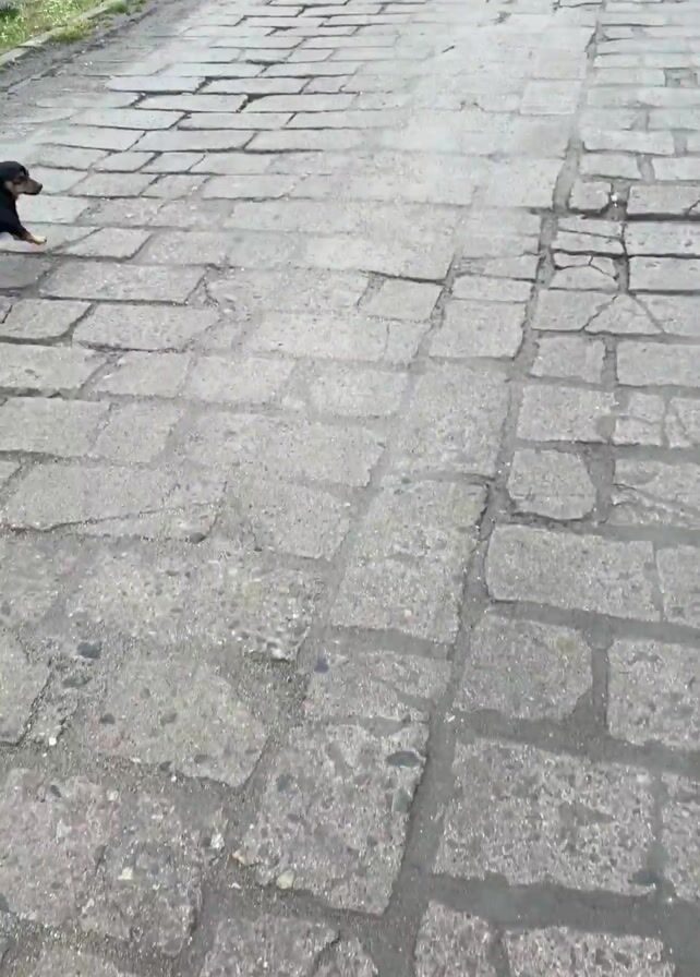 small black and brown dog running on a brick-paved road. The dog is moving away from the camera, heading down the path. The road is made of gray bricks, some of which are cracked and uneven. Along the side of the road, there is a building with a white wall. There is also some greenery growing along the edge of the road. The overall environment appears to be an outdoor, possibly urban setting.