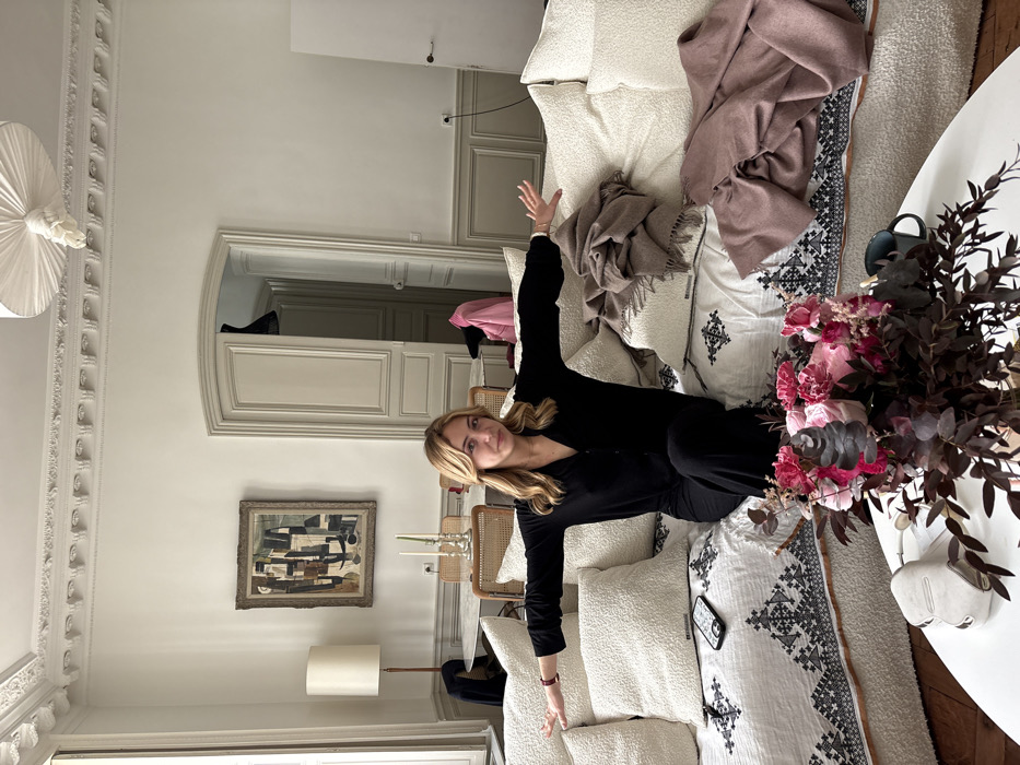 The image captures a young adult female posing in a stylish living room and dining area, indicative of a Parisian apartment with its high, ornate ceilings featuring white decorative molding, light grey paneled walls, and classic Haussmannian-style double doors with arched tops. The woman, with shoulder-length blonde hair, is seated centrally on a large, textured white sofa. She wears a black long-sleeved button-down top and matching wide-leg trousers. Her arms are extended horizontally to her sides, palms slightly open, as she gazes directly at the camera with a neutral expression. A dark-colored watch is visible on her left wrist. The sofa is partially covered by a white blanket with a prominent black geometric pattern, and several textured white throw pillows are arranged around her. A black smartphone with a white screen is positioned on the sofa cushion to her left. On the right side of the sofa, two throws, one brown with fringes and another solid dusty rose, are casually draped. In the immediate foreground, a round white coffee table presents a vibrant bouquet of pink and red flowers with dark foliage, a pair of silver Apple AirPods Max headphones in their case, and a dark mug. The background reveals an interior furnished with an oval white marble-top dining table, surrounded by light-framed cane-back chairs. A silver candelabra with two candles sits on the dining table. An abstract framed painting with geometric shapes and earthy tones hangs on the wall above the table. To the far left, a tall floor lamp with a white cylindrical shade stands near a window. A light grey arched double door in the center-right background is ajar, revealing a darker interior space where a pink garment is visible. A large, pleated white fabric light fixture hangs from the ceiling in the upper right.