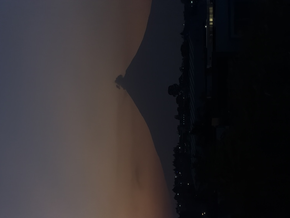 A mountain silhouette dominates the view against a dusky sky, possibly at dawn or dusk. A plume of smoke or vapor emanates from the mountain's peak. Trees and buildings line the right edge, transitioning to darkness. Their lights are visible. The left side is filled with a hazy sky.