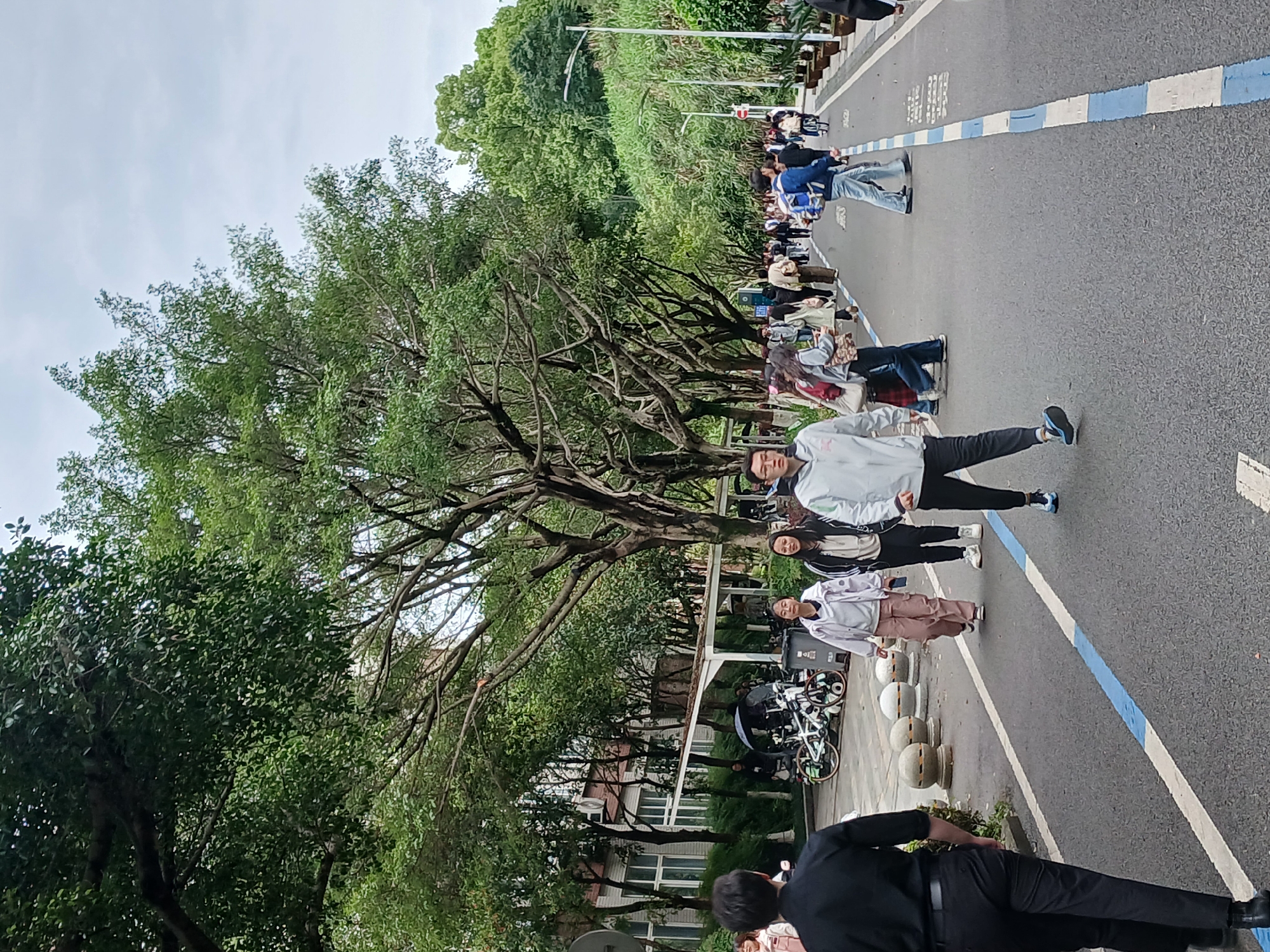 A street scene in Chongqing High-tech Zone, China, shows a group of people walking along a paved road with a blue-and-white painted stripe. Trees line one side of the road. The people are dressed in casual clothing and appear to be walking in the same direction. There are parked bicycles near some concrete ball barriers. A building is visible behind the trees. The sky is overcast.