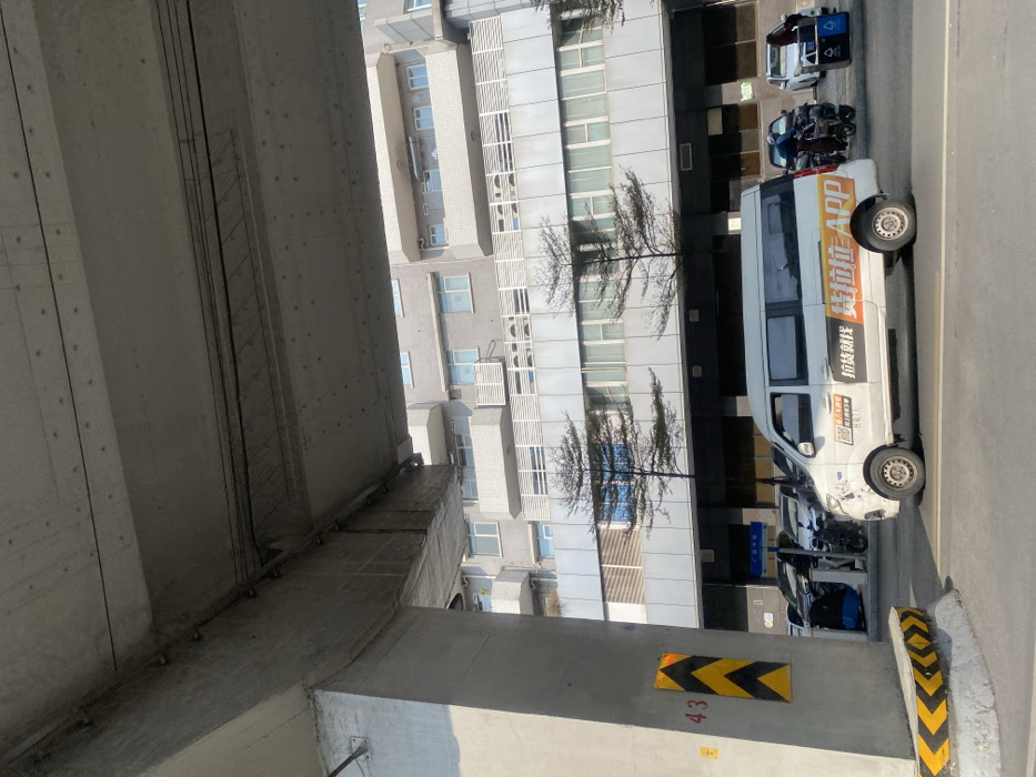A white van with advertisements is parked along a road, next to a curb marked with black and yellow chevrons. Buildings of apartments and offices fill the background, including a tree's shadow. The photo is taken from under a concrete structure with structural steel, in partial shadow. A sign with the number 43 and an arrow is on the concrete wall. Several cars are parked in a row behind the van.