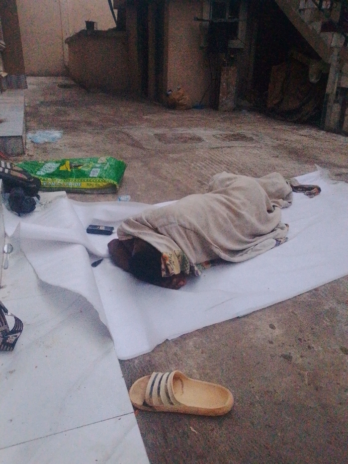 In Alor, Nigeria, an outdoor scene on a concrete surface depicts a human figure lying on a white sheet or tarp