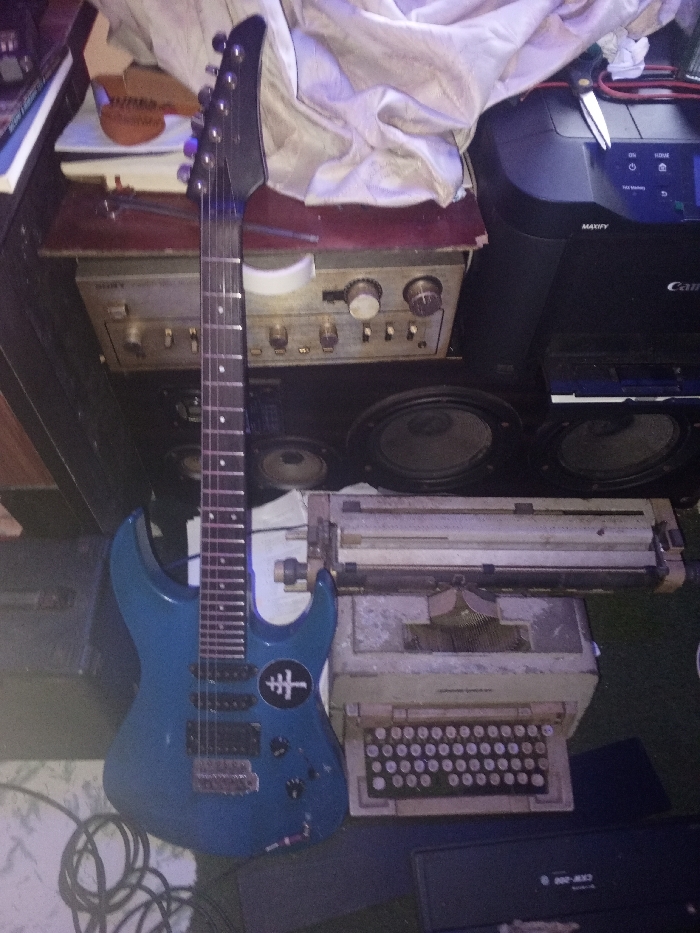 A blue electric guitar with a black sticker stands next to a vintage typewriter. Behind them, a SONY stereo receiver sits atop speakers. A Canon printer rests to the right, partially covered by a white cloth. Cables and additional electronic equipment surround the setup.