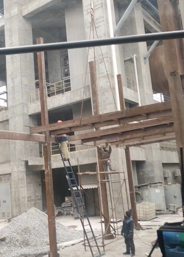 view from inside the cab of a crane, looking out at a construction site. Several construction workers are visible on scaffolding, some of whom are using a ladder to access higher areas. The crane operator's legs, clad in jeans and light-colored socks, are visible. Two screens are mounted on the dashboard, displaying information, including a visual of the crane's arm and what appears to be its weight distribution. The crane operator appears to be at a standstill.