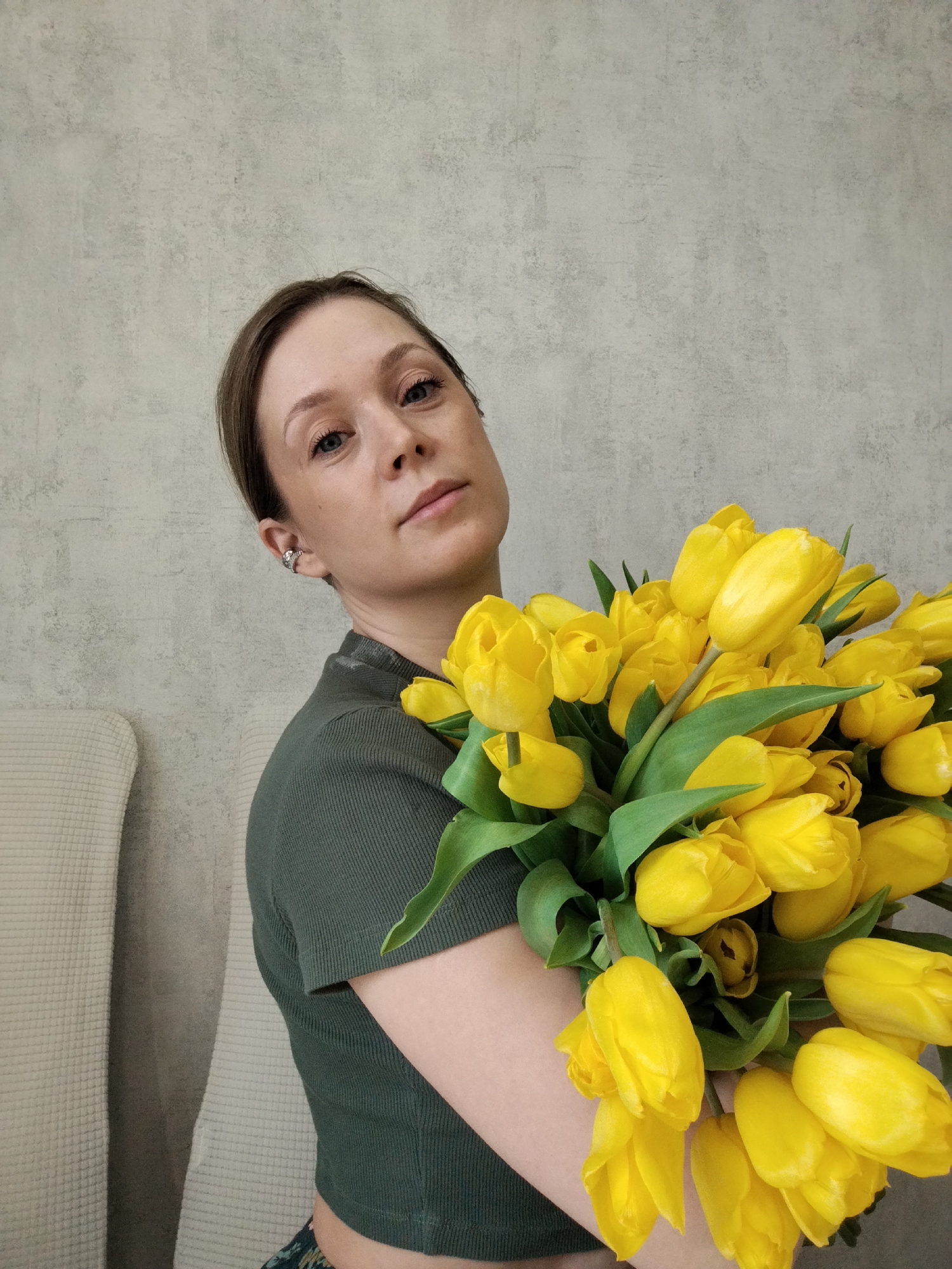 - "A woman is depicted in a medium shot indoors, partially obscured by a large bouquet of yellow tulips" by FM-KQewL2, licensed under CC BY 4.0