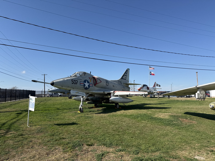 Aviation museum display featuring vintage military aircraft. Prominently displayed is an A-4 Skyhawk fighter with the number "507" and a U.S. star emblem, surrounded by neatly manicured green grass. In the background, two flagpoles display the U.S. and Texas flags. An additional fighter jet and a large wing section of another plane are also visible. The sky is clear, and power lines stretch across the upper part of the frame.