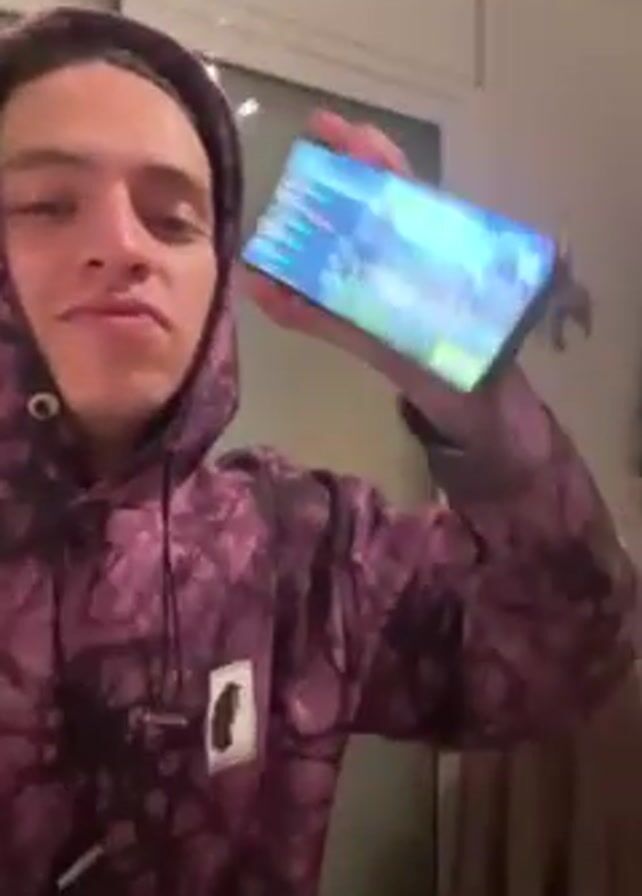 A person wearing a purple tie-dye hooded sweatshirt stands in front of the camera and displays a smartphone. The screen of the phone shows a game, possibly a shooter, with green fields and characters. The person makes a neutral expression. In the background, there is a white wall, a door, and a decorative object.