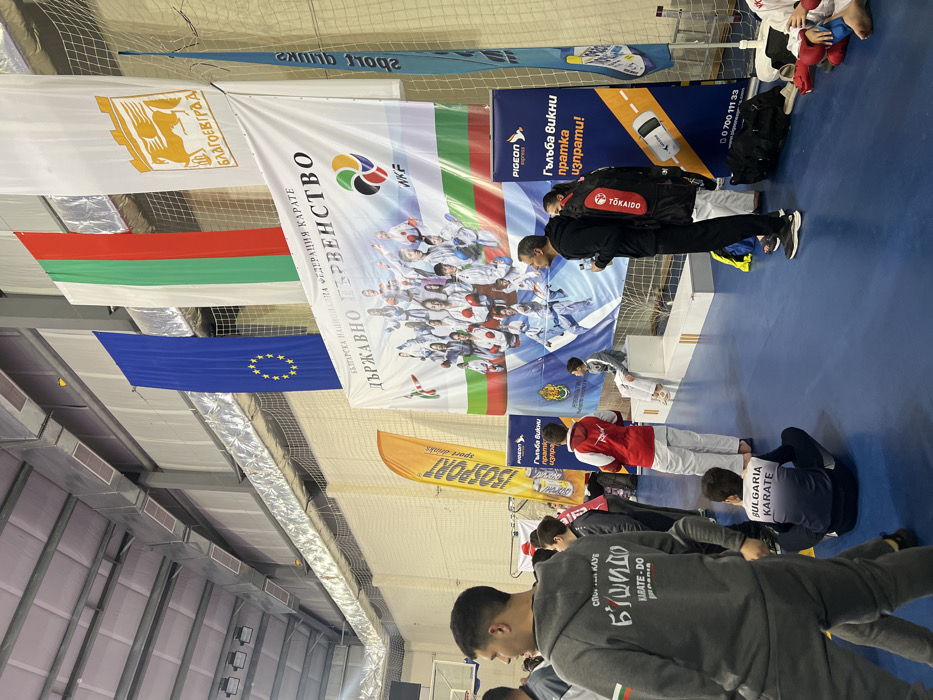 The image depicts an indoor sports hall in Blagoevgrad, Bulgaria, configured for a karate event
