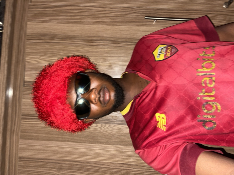 A dark-skinned male individual is depicted from the chest up, facing directly towards the camera in an indoor setting in Unguwar Gabas, Nigeria. He is wearing a bright red, shaggy, furry hat and black sunglasses that obscure his eyes. A trimmed beard is visible on his chin and jawline. He is dressed in a short-sleeved red football jersey featuring a yellow collar and sleeve cuffs. The jersey displays a yellow "NB" (New Balance) logo on the left chest, an AS Roma crest on the right chest, and a yellow "digitalbits" sponsor logo across the center. The fabric of the jersey exhibits a subtle diamond pattern. The background consists of a light brown wooden surface with vertical graining, consistent with a paneled wall or door, with a metallic handle partially visible on the right.
