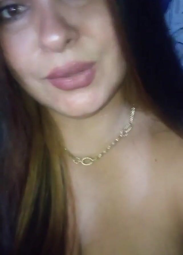 Here is a detailed description of the video: The video is a close-up shot of a woman's face and upper torso. She has light skin, dark brown hair with some lighter strands, and brown eyes. She is wearing a delicate gold chain necklace. Her lips are colored with a light pink lipstick. She looks directly at the camera and moves her lips as if she is singing or talking, although the audio consists of music. The background is blurred, showing what appears to be a blue and white textured surface. The lighting is somewhat dim.