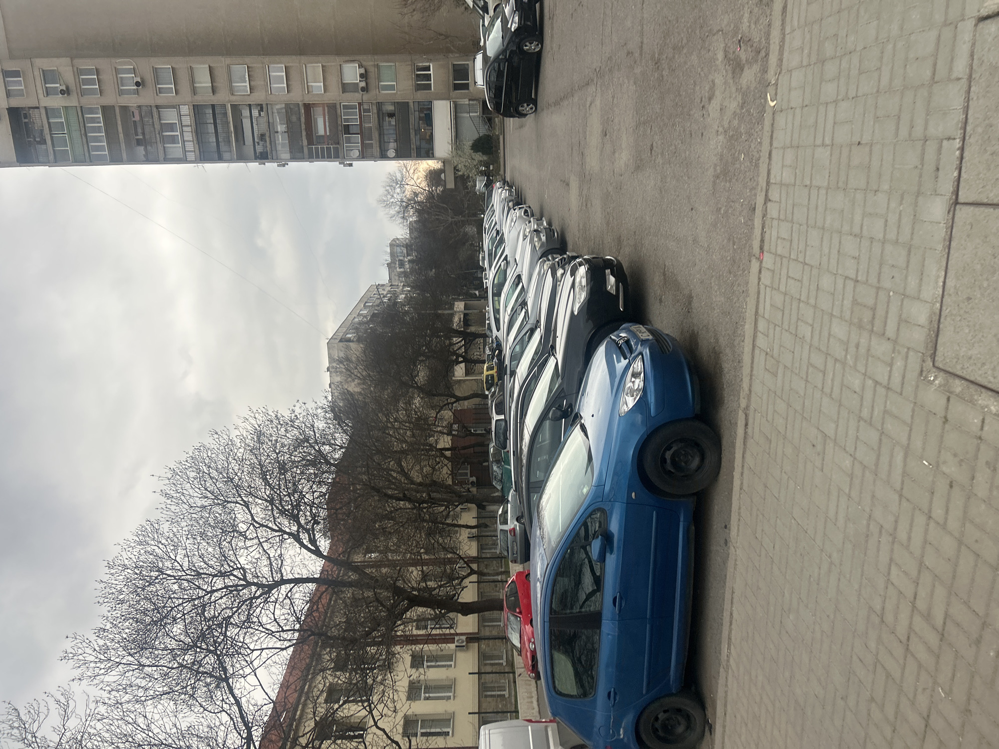 The image depicts an outdoor parking lot in Sofia, Bulgaria, under an overcast sky, indicating either late winter or early spring due to the bare deciduous trees