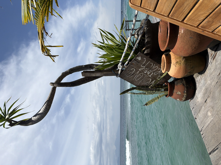 The image depicts a coastal scene in Batununggul, Indonesia, from a low-angle perspective on a weathered wooden deck or pier. The sky is partially cloudy with blue patches and scattered white stratocumulus clouds. The foreground consists of multiple terracotta pots and a portion of a light-colored wooden structure, possibly a chair or table, on the right. Three prominent terracotta pots are arranged on the deck. From left to right: a rustic, dark brown pot containing a snake plant (Sansevieria trifasciata) with upright, variegated green and yellow leaves; a lighter orange-yellow pot; and a reddish-brown pot. Behind these, a larger dark pot holds lush green foliage. A roughly rectangular wooden sign, angled diagonally, is suspended between the large pot and a thick wooden post. White painted text on the sign reads "WE LOVE THE BEACH." A thick white and blue rope is tied around the wooden post. Dominating the central composition is a distinctive tree with a gnarled, dark brown trunk that curves upward and then downward, forming an inverted U-shape. This tree, likely a pandan, features green, spiky leaves at its apex. A vertical wooden support is visible behind the curved trunk. The midground features the turquoise-blue ocean with visible waves, some breaking closer to the deck and others further out. On the distant horizon to the left, a hazy, dark landmass with mountainous contours is visible. To the right, further out in the ocean, a rudimentary wooden pier or structure extends into the water. No individuals are present in the scene.