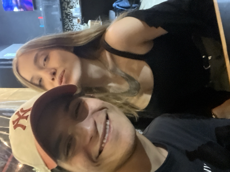 The image depicts two young adults, a male and a female, in a close-up shot within an indoor commercial establishment, likely a bar or restaurant