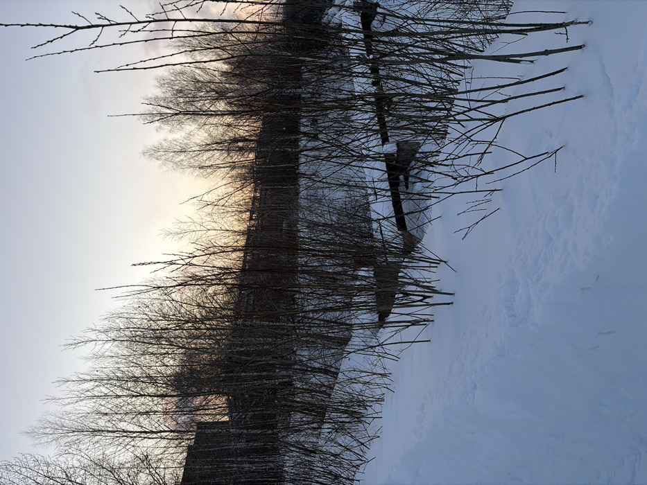 A winter scene shows snow-covered ground meeting bare tree branches against a pale sky