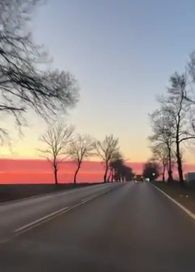 view from inside a car driving down a paved road, with bare trees lining each side. The sky is transitioning from blue to orange and pink at the horizon, indicating either sunrise or sunset. Other cars are visible in the distance on the road. The camera appears to be mounted on the dashboard, providing a driver's perspective. A road sign is visible on the right side of the road.