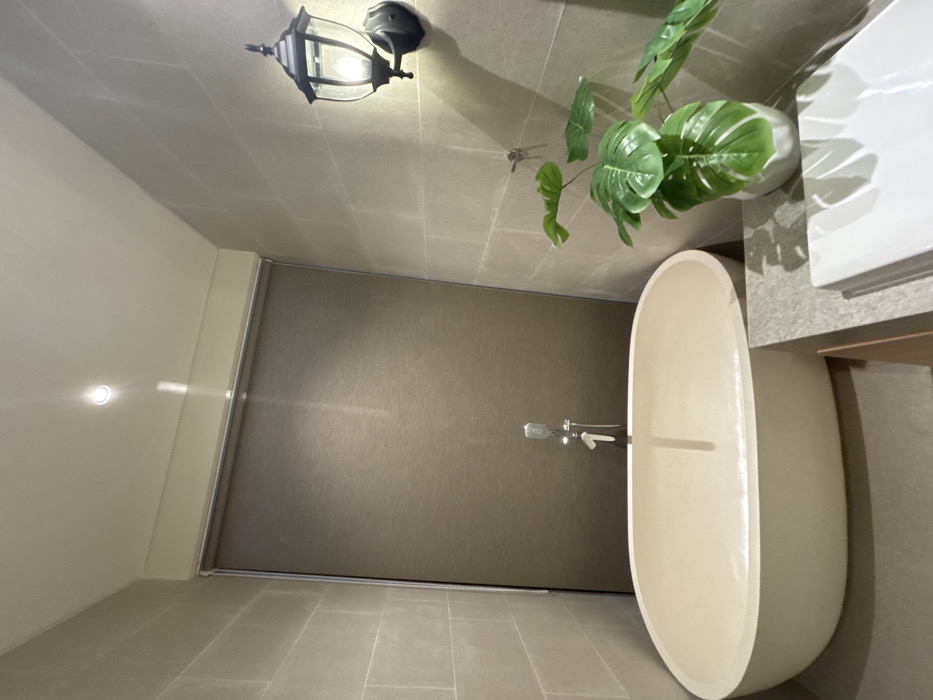 The image displays a modern bathroom located in Kerobokan, Indonesia. The walls are finished with light grey rectangular tiles, complementing a similar light grey floor. A freestanding, oval-shaped, light-toned bathtub occupies the central-left area, equipped with a chrome floor-mounted faucet and a handheld shower attachment. A dark brown roller blind is fully extended, covering the window directly behind the tub. On the right-hand wall, a black, lantern-style wall light fixture is illuminated. Below this light, a set of keys hangs from a small hook on the tiled wall. Adjacent to the tub on the right, a white potted plant, featuring large green leaves consistent with a Monstera plant, rests on a grey countertop. A white rectangular sink is partially visible on the countertop in the lower right. A single recessed light fixture is active in the white ceiling. No individuals or specific actions are observed within the scene.