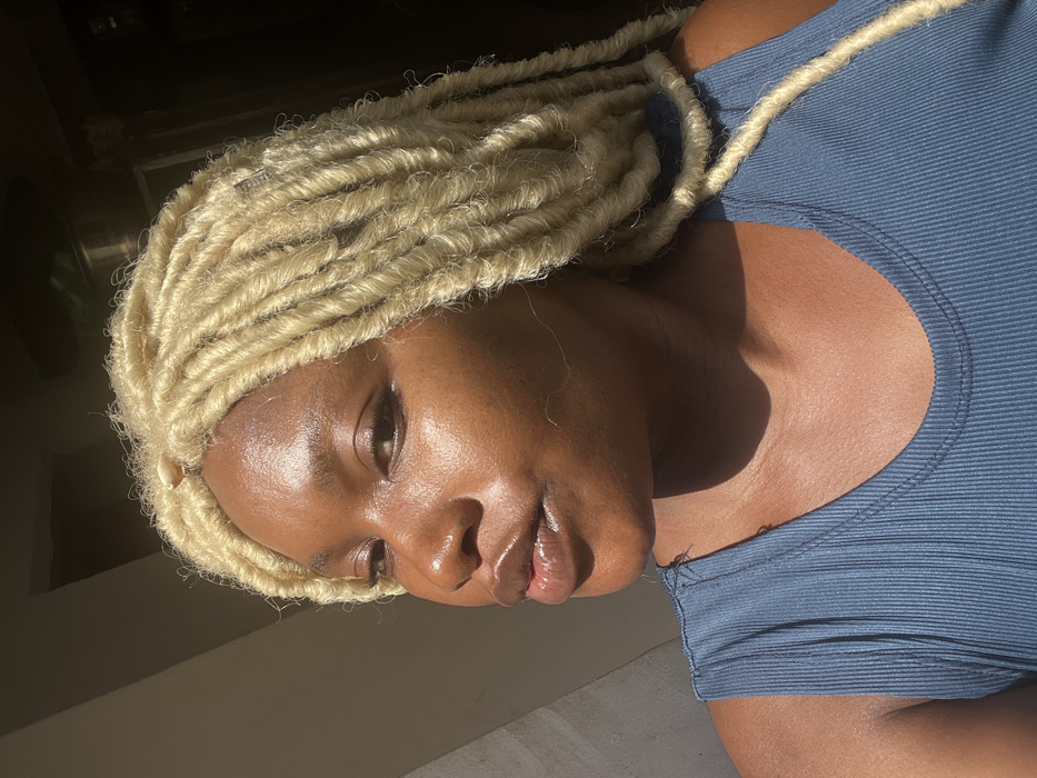 A single adult female with dark skin and blonde faux locs is depicted in a head-and-shoulders shot