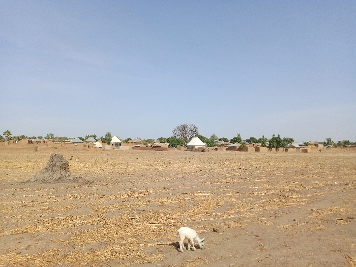 dry, dusty field with scattered dry vegetation. In the distance, a small village is visible, consisting of simple, mud brick houses with thatched roofs. A single white goat grazes in the foreground. The sky is clear and blue, indicating a sunny day. The location is a rural area in Zum, Nigeria, with coordinates 10.116 latitude and 13.047 longitude. The scene suggests a dry, arid climate.