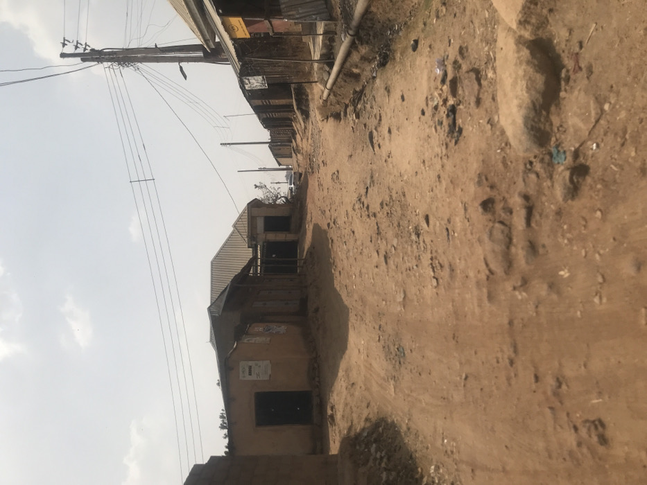 This image depicts an unpaved, reddish-brown dirt road at Rukuba Road, Nigeria, under a hazy, bright sky. The road, showing significant unevenness, rocks, and small scattered debris, stretches into the distance, with faint vehicle tracks visible. No individuals are present. Along both sides of the road are rows of single-story structures. On the left, two primary buildings are visible; the closer one features light brown, possibly mud or unpainted concrete walls, with a dark entrance and several weathered posters affixed to its facade. Behind it stands a larger structure with a prominent, light-colored corrugated metal roof. On the right side, a long line of similar single-story buildings extends down the road. These structures also have earth-toned walls and corrugated metal roofs. One building in the foreground on the right features a yellow sign. A dark-colored drainage or utility pipe runs along the base of these buildings, partially embedded in the ground. Numerous utility poles, some appearing wooden and others possibly concrete, stand along the road, particularly on the right. They are laden with multiple strands of overhead power lines and cables. One taller pole on the right supports a street light fixture. A distant, light-colored vehicle is barely discernible at the far end of the road. The overall scene suggests a semi-urban, unmaintained environment.