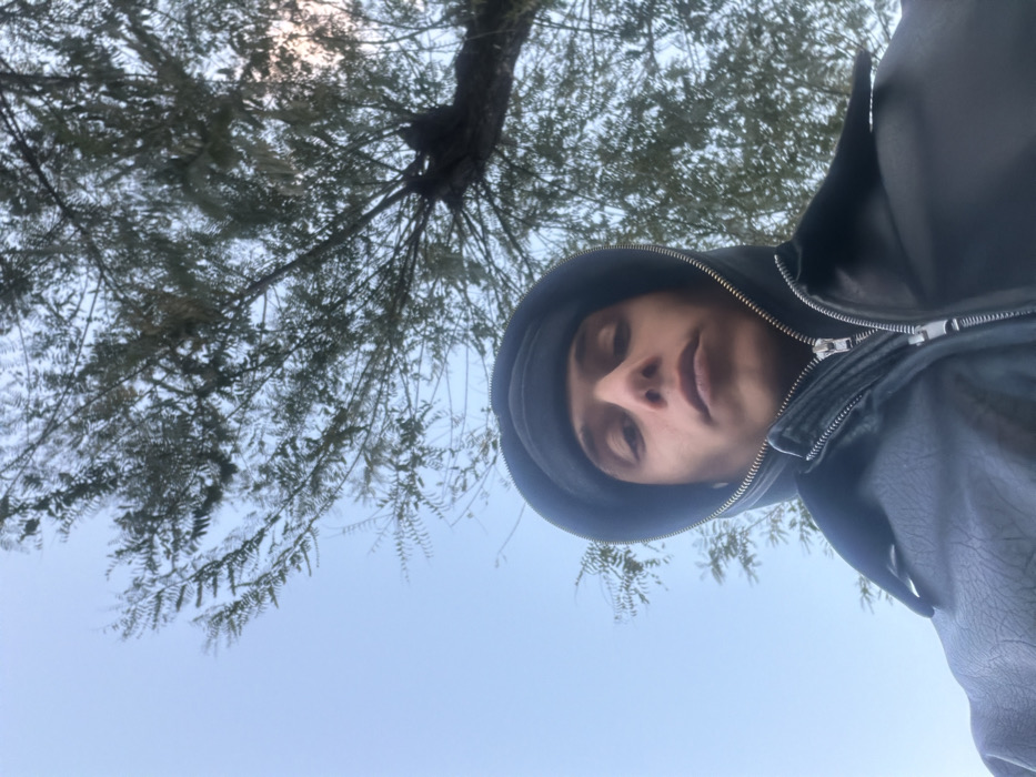 A low-angle outdoor image depicts a young individual in Migdal HaEmeq, Israel. The subject, positioned in the lower half of the frame, faces the camera directly with a neutral expression. They wear a black beanie, a dark hooded garment with the hood up, and a black leather-like jacket featuring prominent silver zippers. The upper portion of the scene consists of a pale blue sky on the left, and a tree with dense green foliage and visible branches on the right, extending across the upper background. No other subjects or objects are discernible.