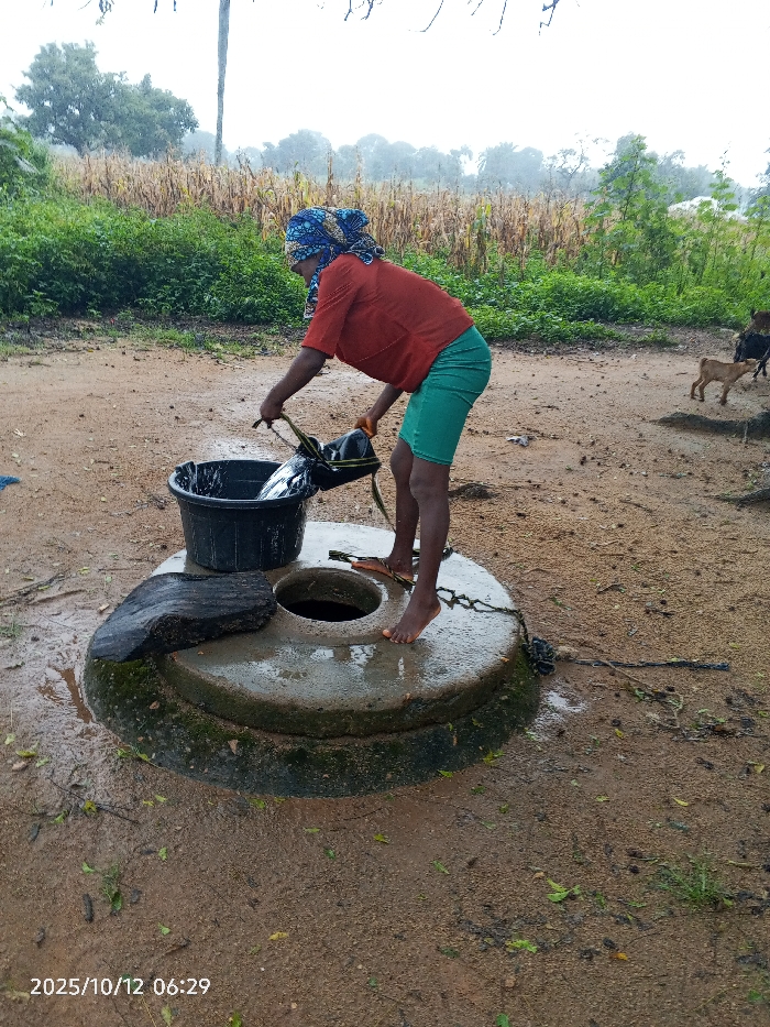 An individual is depicted drawing water from a well in Kamantan, Nigeria, on October 12, 2025, at 06:29