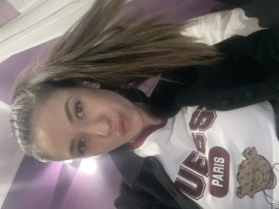 The image displays an adult female in a close-up indoor selfie. She possesses long, brown hair styled in a high ponytail. Her facial features include brown eyes and a light complexion, with her lips pursed in a "kissing" pose directed towards the camera. She is dressed in a white long-sleeved shirt featuring a burgundy collar and a graphic that reads "GUESS PARIS" in burgundy lettering, accompanied by a patterned brown teddy bear head. Over this shirt, she wears a dark, possibly black, buttoned cardigan or jacket. The background consists of a purple wall on the left, illuminated by a bright, localized light source causing a lens flare effect. A vertical white object, resembling a curtain or door frame, is partially visible on the right. No specific visual identifiers within the image provide a discernible location within the city of Sofia, Bulgaria; the setting is generalized as an indoor environment.