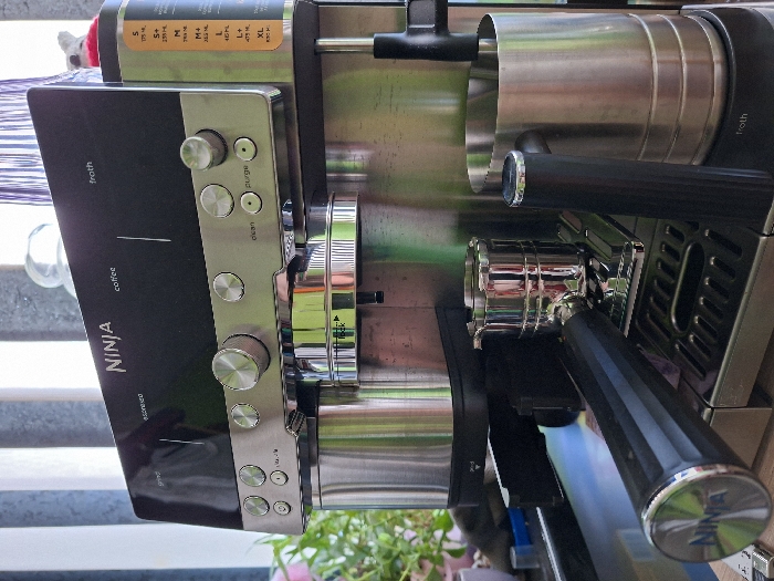 - "The image displays a Ninja brand coffee and espresso machine, primarily constructed from stainless steel and black materials, situated indoors at an unspecified location in Rakitovo, Bulgaria" by FM-eXIDh1, licensed under CC BY 4.0