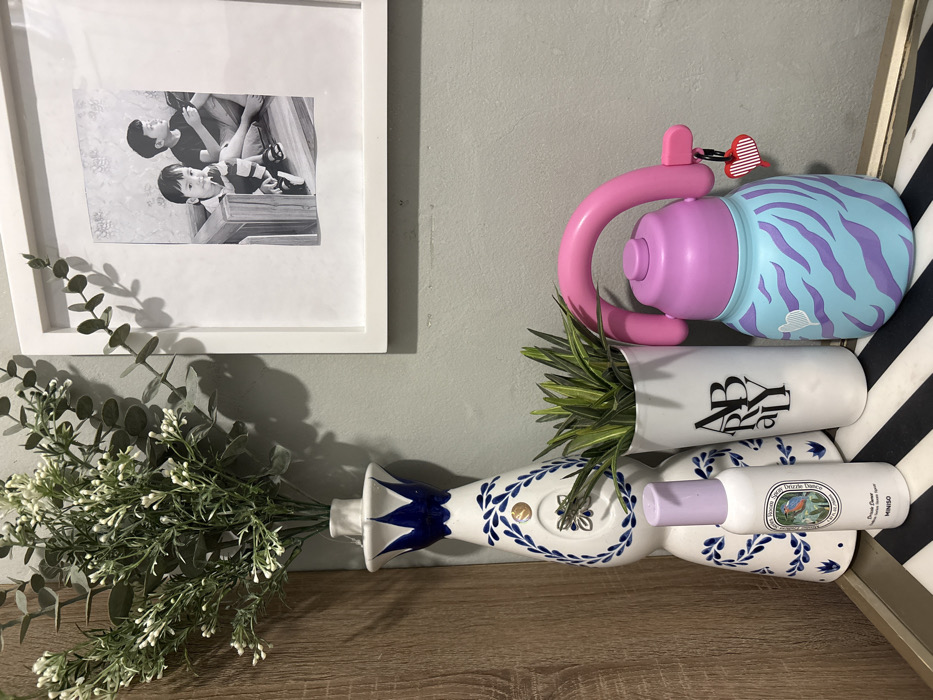 This indoor scene, observed in South Jakarta, Indonesia, is set in a corner, consistent with a residential or commercial space. The background consists of a light grey-green painted wall on the right and a vertical light brown wooden panel on the left. Mounted on the grey-green wall is a white rectangular picture frame containing a black and white photograph. The photograph depicts two young Asian boys seated; the younger boy on the left wears a striped shirt and sandals, looking forward, while the older boy on the right wears a dark t-shirt and shorts, looking to the right and appearing to hold a small object. Below the framed photograph, a collection of decorative objects is arranged on a surface featuring a black and white diagonal striped pattern. On the left, a tall, multi-sectioned white ceramic bottle, adorned with blue stylized patterns and a small golden circular emblem, serves as a vase. It holds artificial green foliage with small white blossoms, resembling baby's breath and eucalyptus. Adjacent to this, a small white cylindrical room spray bottle, branded "Diptyque" and "MINISO," stands with a lavender-colored cap and a bird illustration on its label. To its right, a white cylindrical vase with the partial black inscription "ABRARY" vertically holds artificial green, spiky-leaved plants. On the far right, a brightly colored water bottle or thermos is positioned. It features a pink curved handle and lid, and its main body is light blue with purple tiger-stripe patterns and a small white heart outline. A small charm, shaped like a red and white striped heart, is suspended from a black clip attached to the pink handle. Soft shadows are visible on the wall behind the objects, indicating ambient indoor lighting.