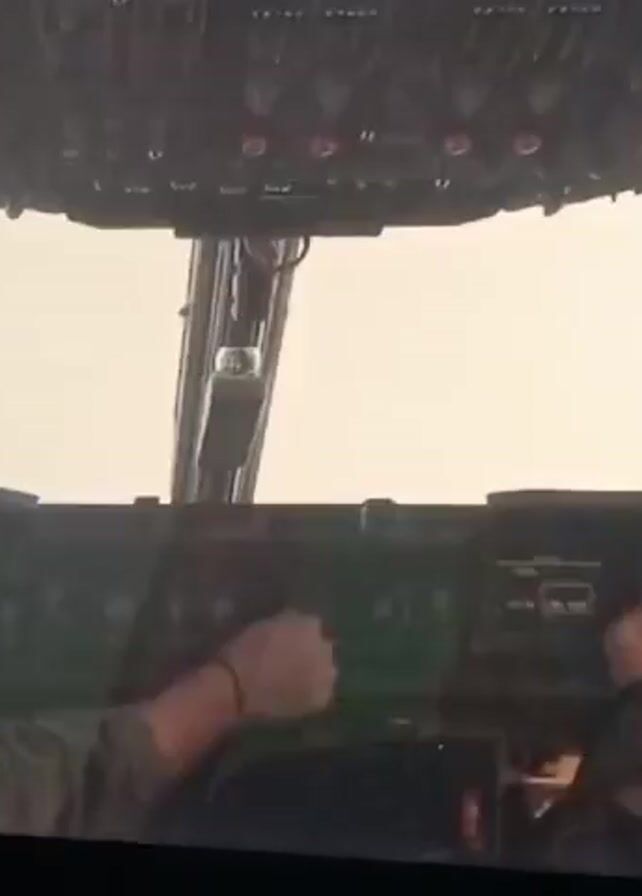 interior of an aircraft cockpit. First, we see another plane in the distance outside the window. Then, the view changes to inside the cockpit, with two people in pilot seats wearing headsets and dark clothing. They both appear to be manipulating controls on the dashboard in front of them.