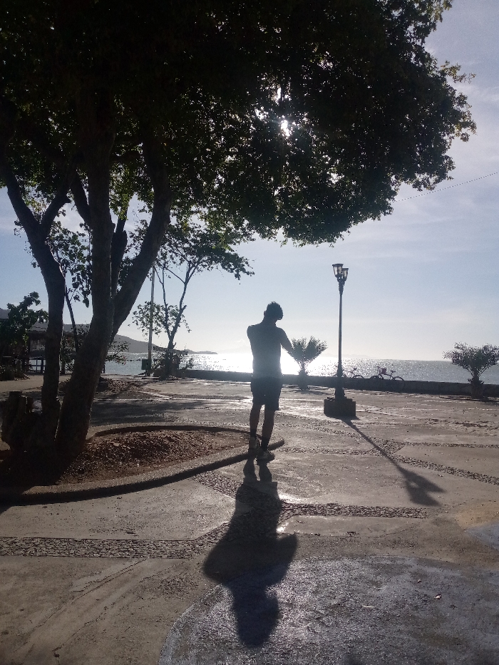 The scene depicts a coastal promenade in Juan Griego, Venezuela, under strong backlighting, likely during sunrise or sunset. A single individual, an adult human, is centrally positioned and heavily silhouetted, observed from behind. The person is standing on a paved surface, wearing shorts and a short-sleeved top, with arms slightly bent and held away from the body, and head tilted down. A prominent, elongated shadow of the individual extends into the foreground on the damp, patterned concrete ground, which shows reflective wet patches. To the left, a large, mature tree with dense foliage occupies the upper left quadrant, obscuring the primary light source but allowing bright sunbeams to penetrate its canopy. Around the base of this tree is a circular area of loose earth or mulch. Further left, partially obscured by the tree, is a small wooden structure or platform. On the right, a dark, ornate streetlamp with two fixtures stands tall, casting a long shadow across the pavement. Beyond the streetlamp, a bicycle is faintly visible near the water's edge. In the mid-background, a body of water, likely a bay or ocean, stretches across the horizon, intensely reflecting the sun's light. Distant hills or mountains are silhouetted against the bright sky on the far horizon. A low wall separates the paved area from the water. A smaller palm-like tree is visible between the individual and the water on the right. The sky above is clear and bright.