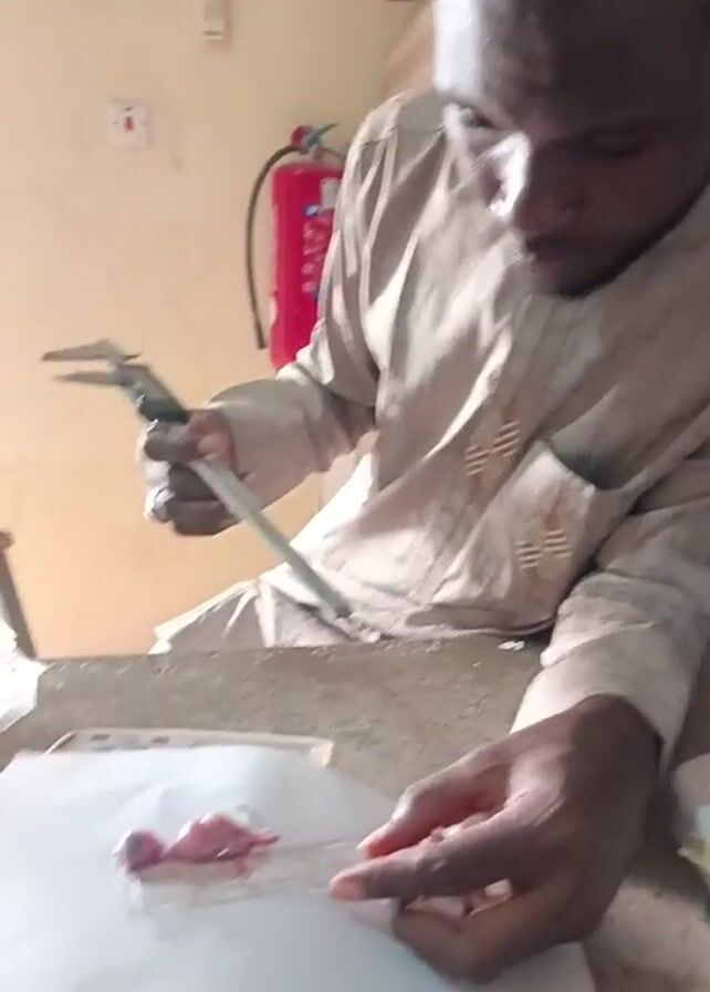 An African man wearing a beige tunic sits at a desk, holding a digital caliper. He is measuring what appears to be a dissected animal fetus, lying on a ruler on top of a sheet of white paper. A red fire extinguisher is visible on the wall behind him.
