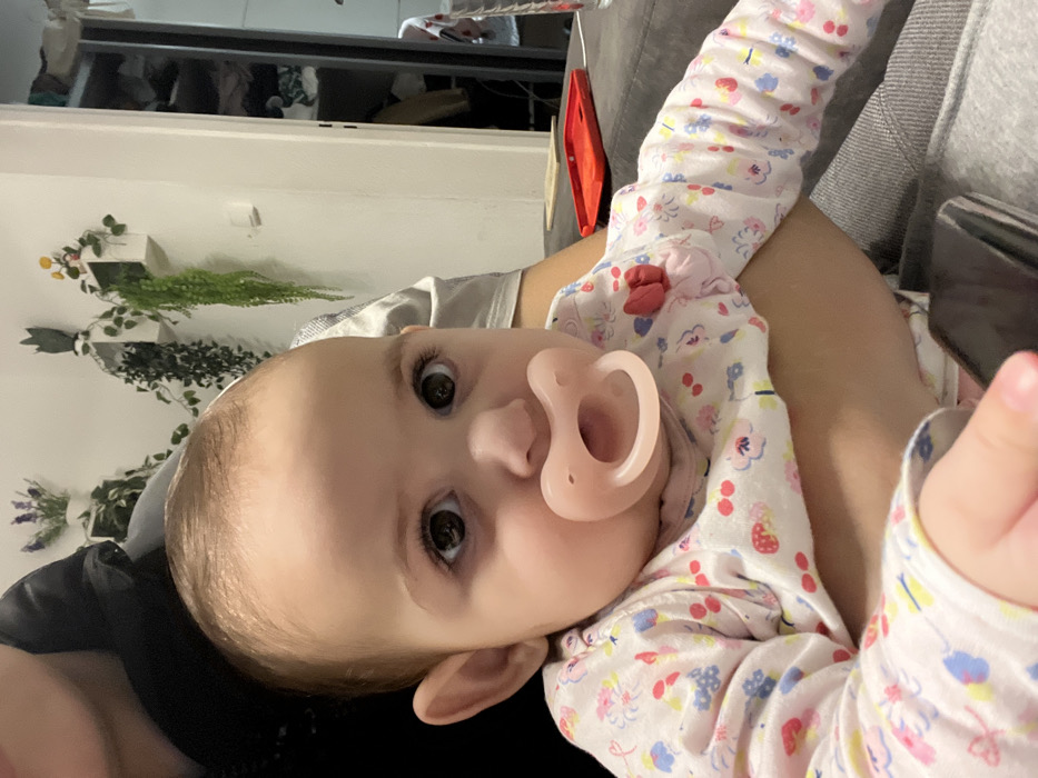 A baby with fair skin and brown eyes lies on their side. They wear a white onesie with a floral print and have a light pink pacifier in their mouth. The baby is held in someone's arms and appears relaxed. In the background, a shelf with various items can be seen, along with decorative plants on the wall.
