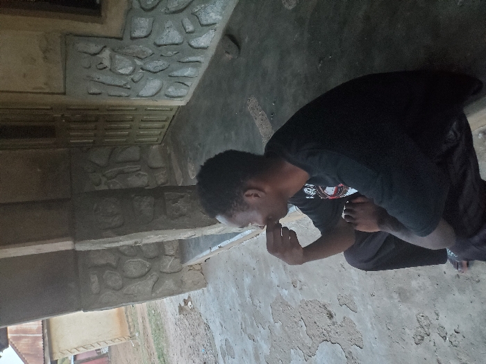 An adult male is seated in profile, facing right, on a concrete verandah in Akwanga, Nigeria