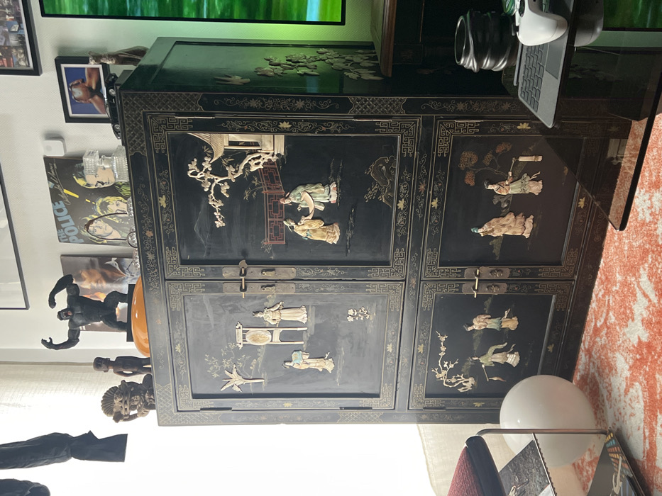 The scene is a detailed interior view of a room located in Plaisir, France. A large, black lacquered cabinet, approximately 1.5 meters in height, stands centrally. The cabinet features four doors, arranged in two vertical pairs, each adorned with intricate mother-of-pearl inlays depicting traditional East Asian figures, pagodas, trees, and landscapes. Gold-colored geometric patterns outline the doors and borders of the cabinet. Each door has a brass-toned metal latch. On top of the cabinet, from left to right, are several items: a partially visible dark fabric item hangs to the far left. Next, a brown carved wooden object and a darker wooden human statuette are positioned. A prominent dark grey King Kong figurine stands on an orange spherical base. To its right are a clear glass decanter, eyeglasses, and a small black model car. Behind these, a framed photograph of a muscular man and a small brown cat-like figurine are visible. Further back, against a white wall, two framed prints or record covers are displayed; one clearly features "THE POLICE" with band members' portraits, while the other shows a man's face. To the right of the cabinet, a large screen displays a bright green and lighter-toned image. Beneath the screen, on a black, reflective table, a dark grey keyboard with a touchpad and a white computer mouse are situated. A black, ribbed cylindrical object rests nearby. In the foreground to the left of the cabinet, a portion of a chair or stool with a dark red upholstered seat and a metal frame is visible. A white spherical object, possibly a lamp, sits on the floor. The floor is covered by a rug with an abstract orange and white pattern. Natural light enters the room from a large window or opening on the left side, illuminating the scene. The room's walls are painted white.