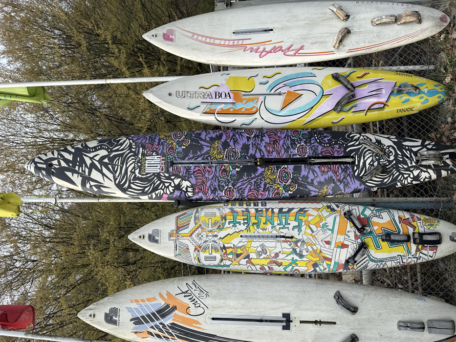 Five vintage windsurf boards stand upright in a row, facing the viewer, in an outdoor setting in Witten, Germany